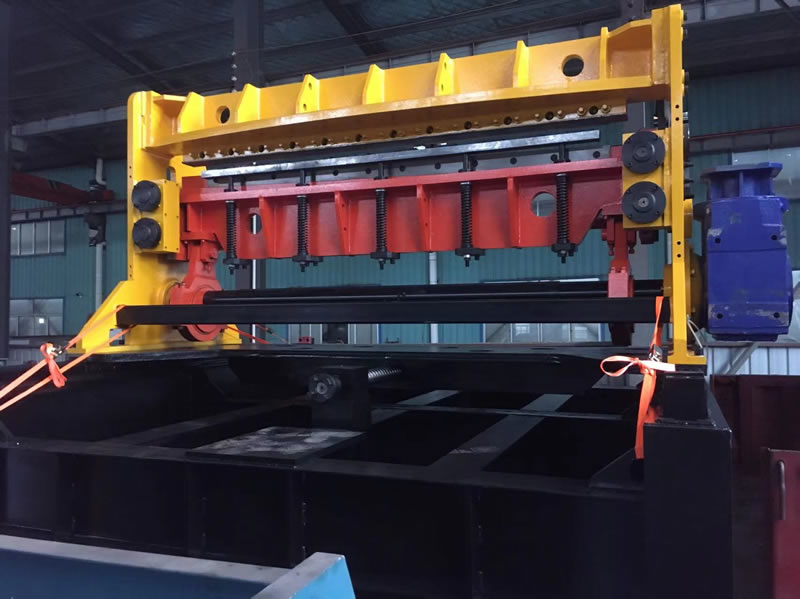 該機(jī)器用于連續(xù)剪切根據(jù)要求而定長度鋼板的設(shè)備。由三部分組成:移動機(jī)架部分、機(jī)座、 電機(jī)、曲軸及伺服傳動部分。