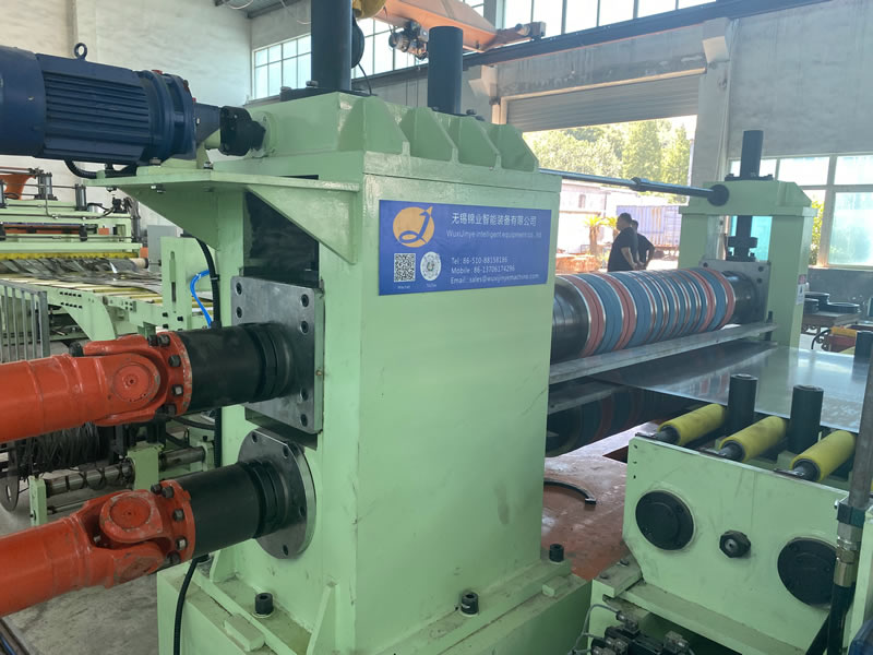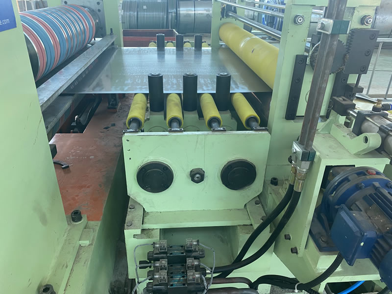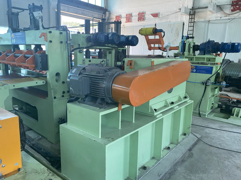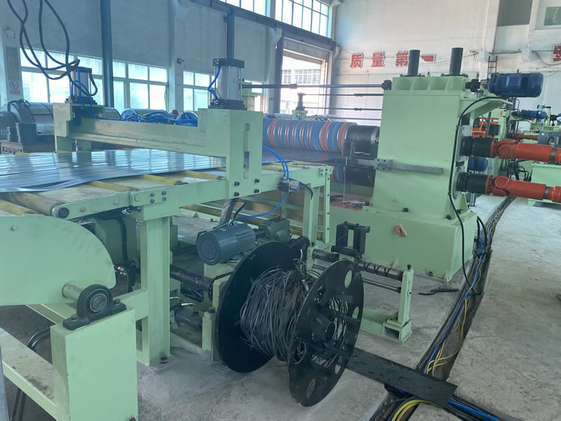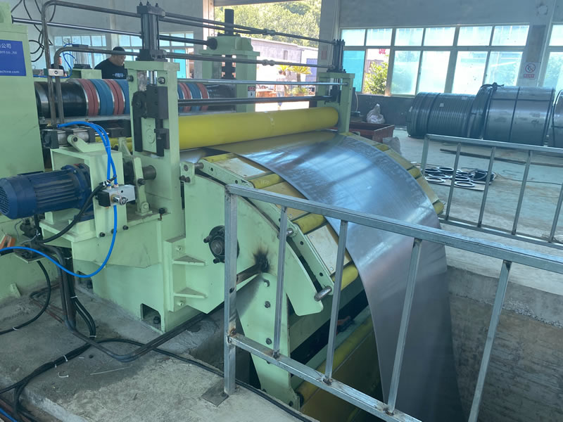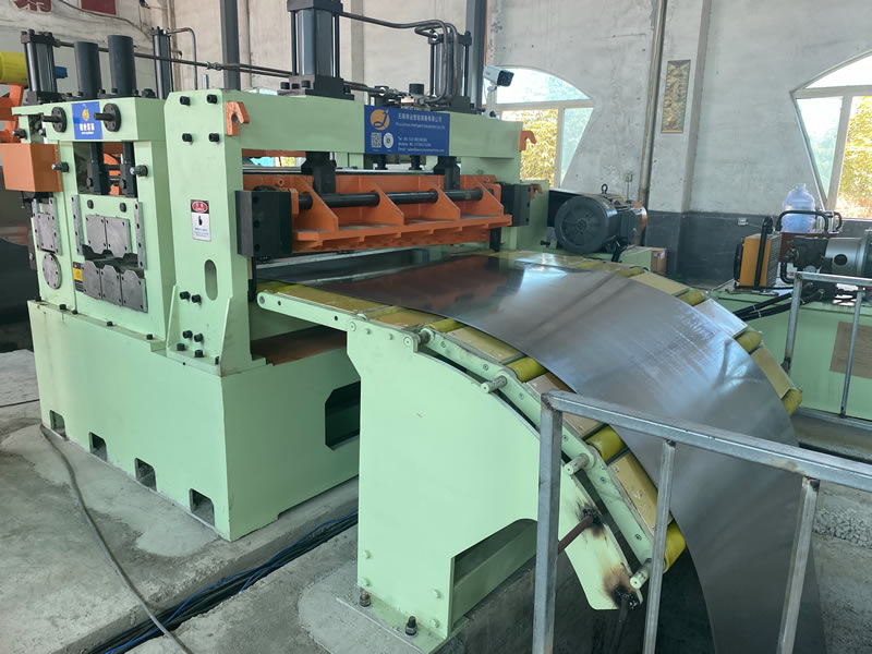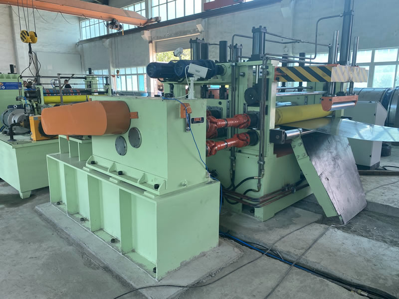 本設(shè)備有開卷、夾送初矯、縱剪、張力、收卷等主要部件組成。設(shè)備工作時(shí)鋼卷上好開卷機(jī)后,壓引鋼板進(jìn)夾送初矯經(jīng)剪切板頭后,過渡調(diào)節(jié)對中進(jìn)入縱剪機(jī)進(jìn)行縱剪分條,分條后帶鋼經(jīng)活套過渡進(jìn)入欲分料張力站,最后由收卷機(jī)卷取成帶鋼卷,經(jīng)打包后由卸料小車輸送出生產(chǎn)線。